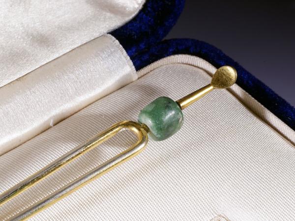 Beau coffret de velours bleu nuit garni de soie, contenant un lien de perles de jade ainsi qu'une épingle à boule dont l'extrémité comporte une sorte de fermoir. Bijouterie Matsuya.