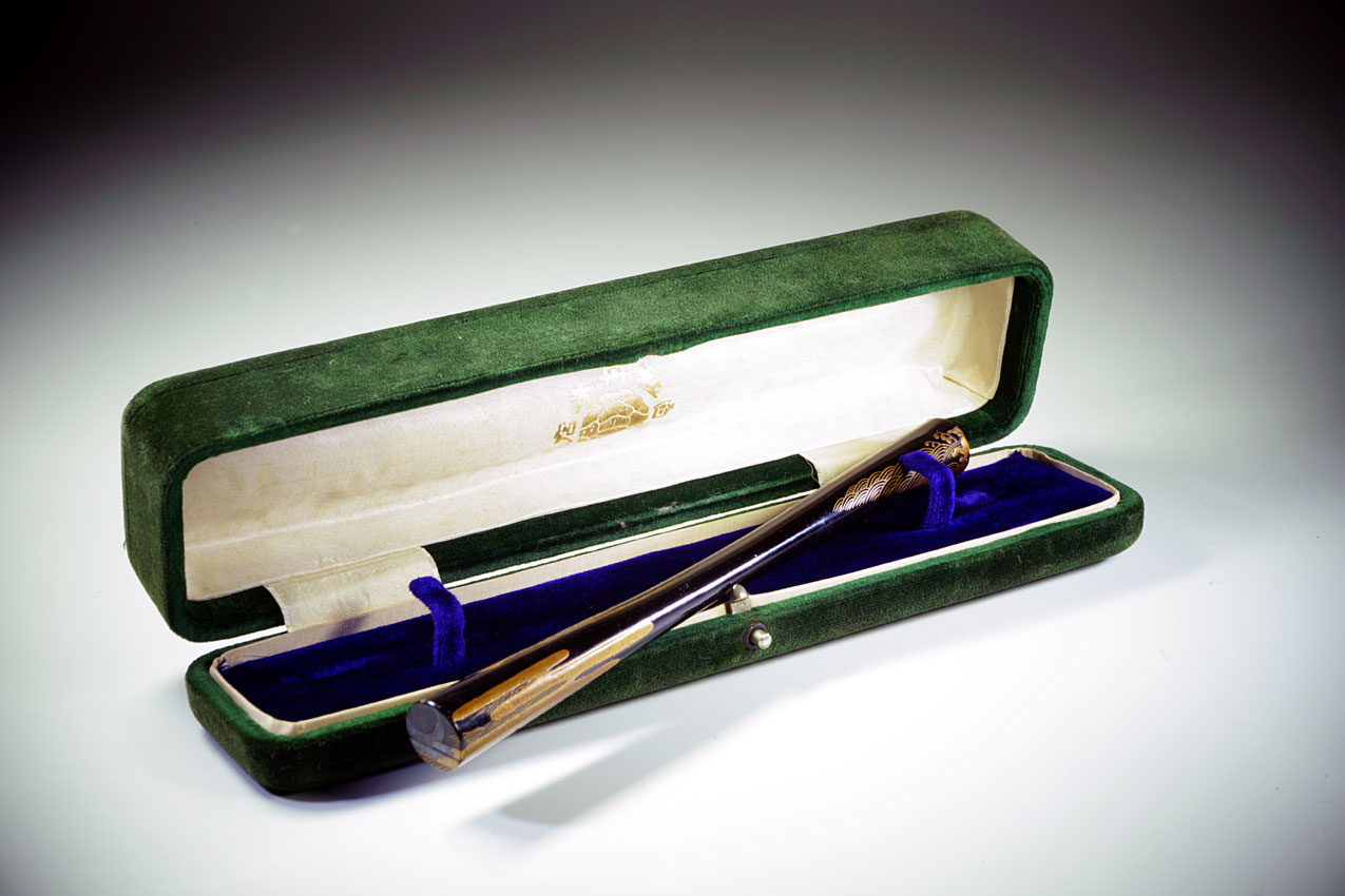 - L'écrin de velours vert, garni de velours violet et de soie grège, magnifie ce bâtonnet "kogai" en bois laqué noir et décoré à l'or de flots et de nuages. A une extrémité on découvre un petit lapin, et à l'autre la lune, allusion sans doute à une légende ancienne. Signature de l'artiste.