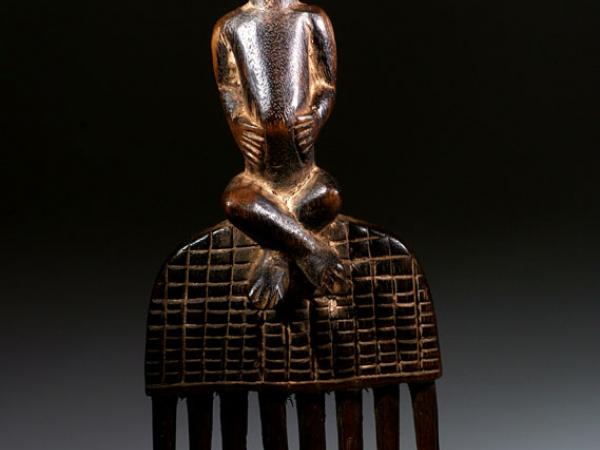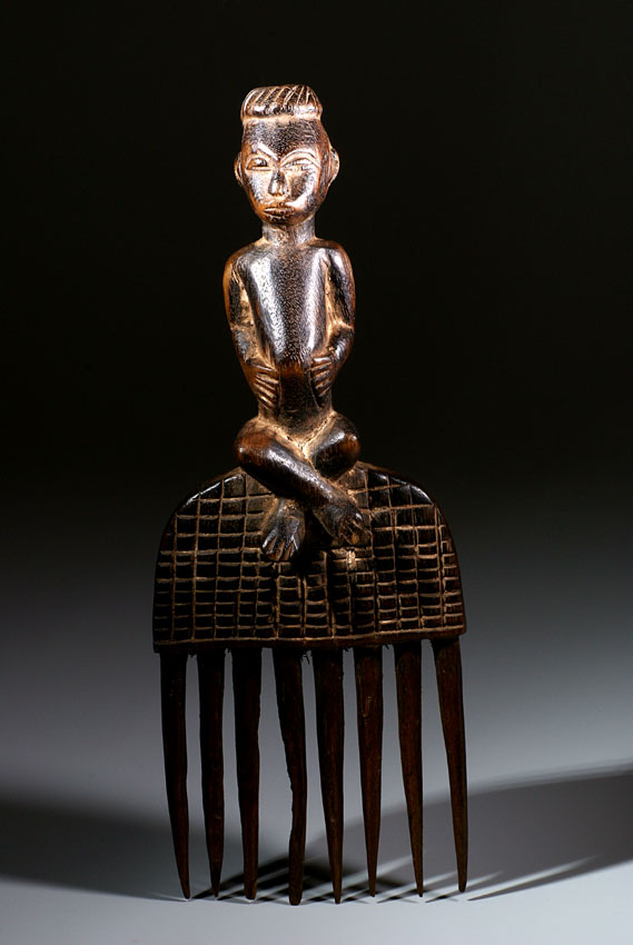 - Peigne à l'effigie d'un personnage assis en tailleur, mains sur le ventre. Coiffure circulaire, haute sur la tête. Un fin quadrillage décore l'âme du peigne.