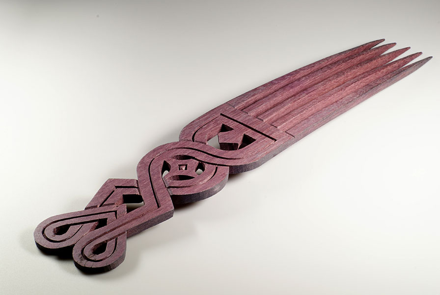- Peigne représentatif de l'art Bushinenge des "Nèg'Marrons" Ndjuka, avec ses entrelacs de figures géométriques. Les Businengue ou Bushinengue sont d'anciens esclaves qui ont fui dans la montagne l'enfer des plantations. Réalisé dans un bois dense, de couleur violette, appelé en Aluku "papa-ati" (crème-cœur).