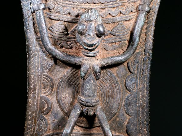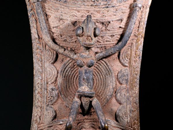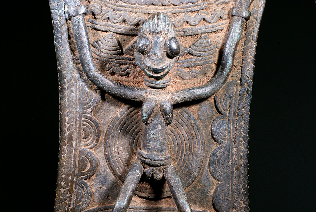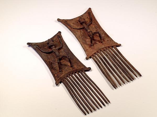 - Magnifique paire de peignes dits "kwèkwè" en bronze avec figures masculine et féminine. La position des personnages de ce couple interpelle ainsi que les bracelets (ou menottes) aux pieds et aux mains. Est-ce que ce sont des captifs ? S'agit-il d'une scène de supplice ? Cette scène étonnante renvoie-t-elle à un mythe ou à un conte ? Même si l'on s'interroge sur le sens de ces deux pièces des Dafing, on reste frappé par leur expressivité et la richesse de leurs détails ornementaux. Les Dafing (appelés aussi Marka) sont une ethnie du Burkina et du Mali habitant la région du bassin du Mouhoun. Acheté à Ibrahim Zonon, antiquaire au Burkina Faso.