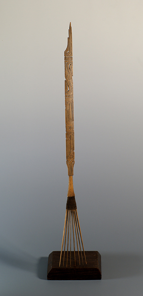 Carved bamboo decorated with totemic birds. The tip is cut to be divided in tooth.